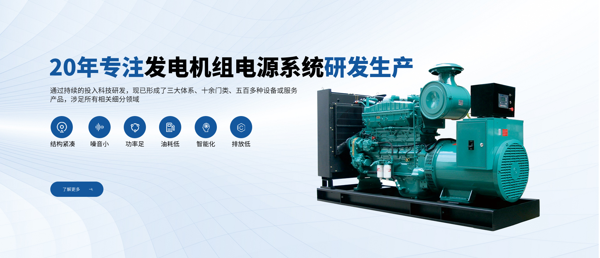 公司一直專注于高品質(zhì)發(fā)電機組及配套設備的研發(fā)、生產(chǎn)、銷售和售后服務,致力于為用戶提供完美的產(chǎn)品和服務。從全球知名配套廠商優(yōu)選零部件及組件,優(yōu)勢組合,打造名牌發(fā)電機組產(chǎn)品。公司在全國設立多處銷售服務網(wǎng)點,體系遍布全國大中城市。